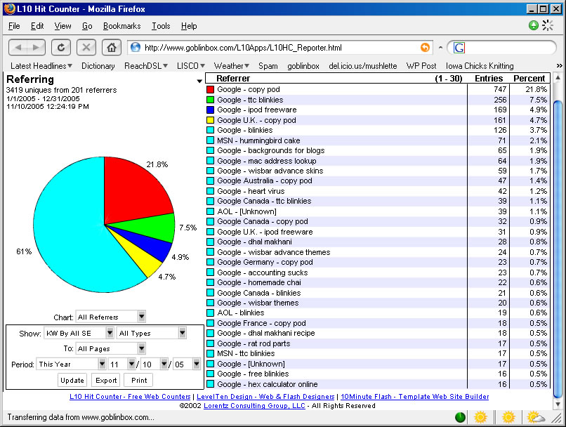 But now when I check my hit counter software, not much is going on. Just normal searches for blinkies, recipes, how to ping from OSX, iPods, subnetting, and miscarriage – you know, content I actually have! (Oh, and of course that good old standby, “accounting sucks.” What do people think they’re looking for when they google “accounting sucks”?)